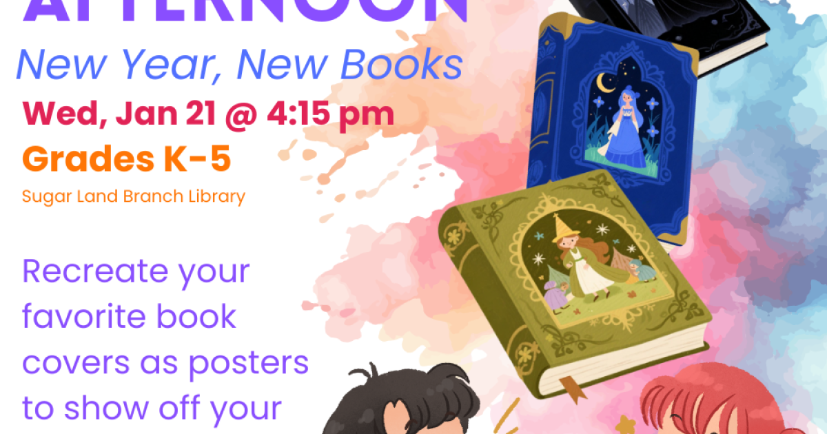 Discover art through hands-on creative projects! Make a new library poster based on your most favorite recent read for everyone to see! Art in the Afternoon is a new series of monthly programs for youth in grades K-5. Materials made possible by the Friends of the Sugar Land Branch Library.