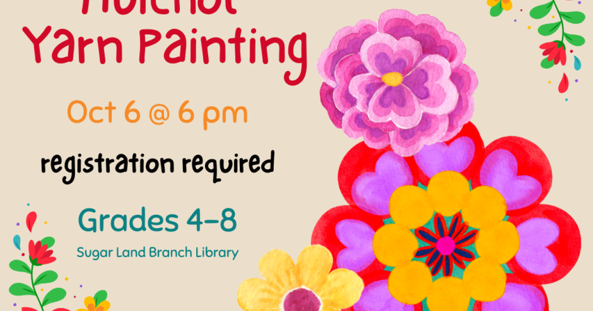 Create a one-of-a-kind work of art to celebrate Hispanic Heritage Month! Youth will make Huichol-inspired pieces with colorful yarn. This vibrant artform originates from the traditions of Mexico. Materials are provided courtesy of the Friends of the Sugar Land Branch Library. Register online or by calling 281-238-2140. This program is for students in grades 4-8.