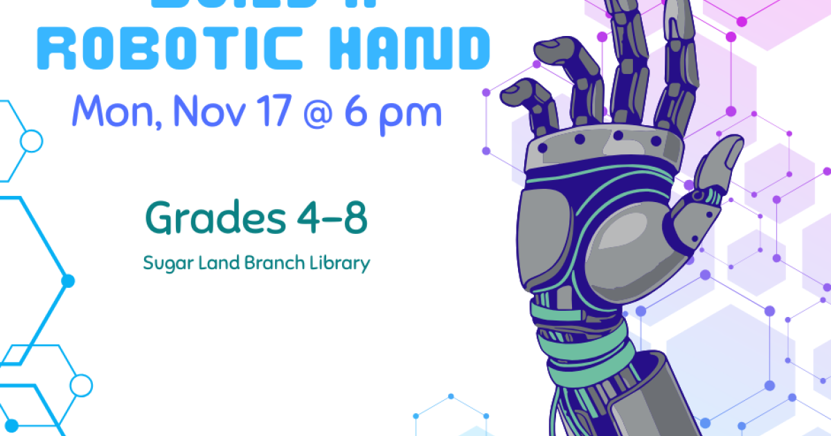 Create a moveable cardboard hand! Youth will build a simple robotic hand using common household materials. Supplies and refreshments are provided courtesy of the Friends of the Sugar Land Branch Library. This program is for students in grades 4-8.