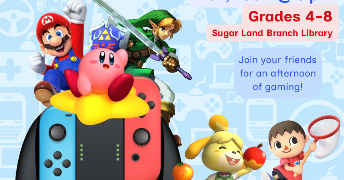 Join us for a fun game night and social hour! Kids in grades 4-8 are invited to relax and play a variety of popular Nintendo Switch games, like Mario Kart, and enjoy some snacks with their friends. Materials and refreshments for this program are provided courtesy of the Friends of the Sugar Land Branch Library.