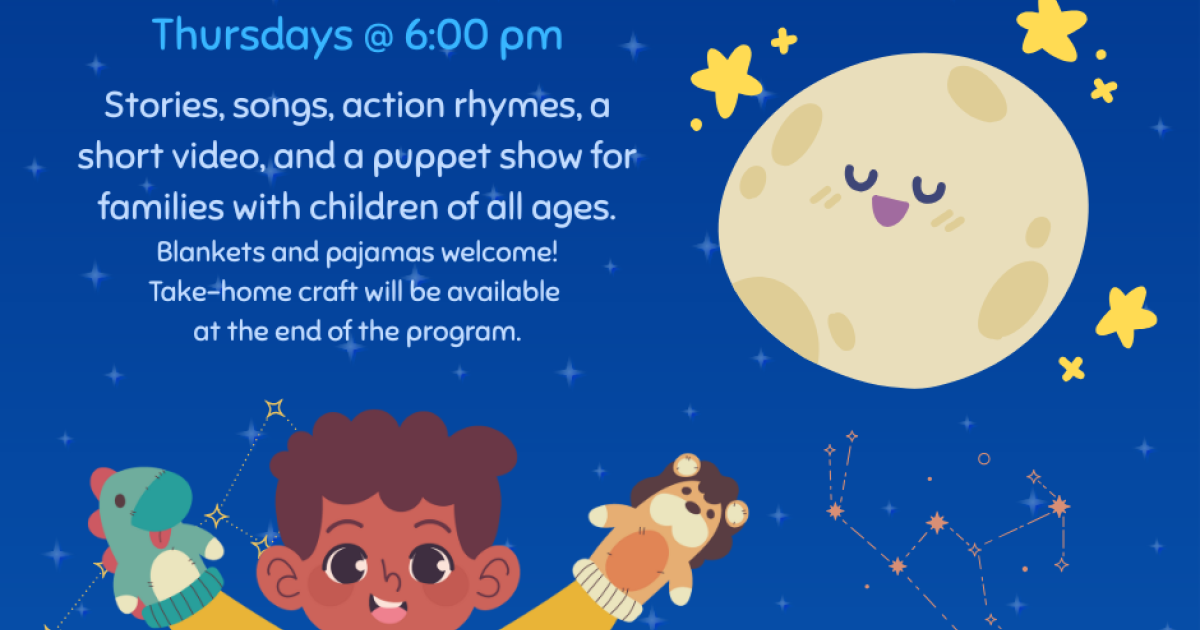 Stories, songs, action rhymes, a short video and puppet show for families with children of all ages. Blankets and pajamas welcome! Take-home craft will be available at the end of the program.
