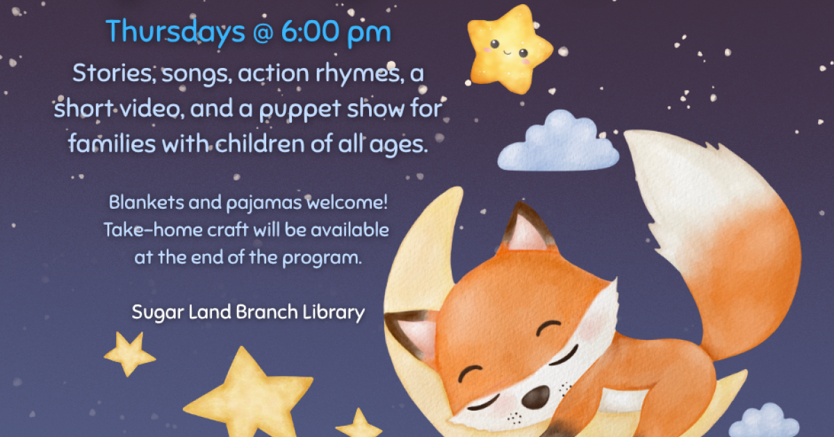 Stories, songs, action rhymes, a short video, and puppet show for families with children of all ages. Blankets and pajamas welcome! Take-home craft will be available at the end of the program.