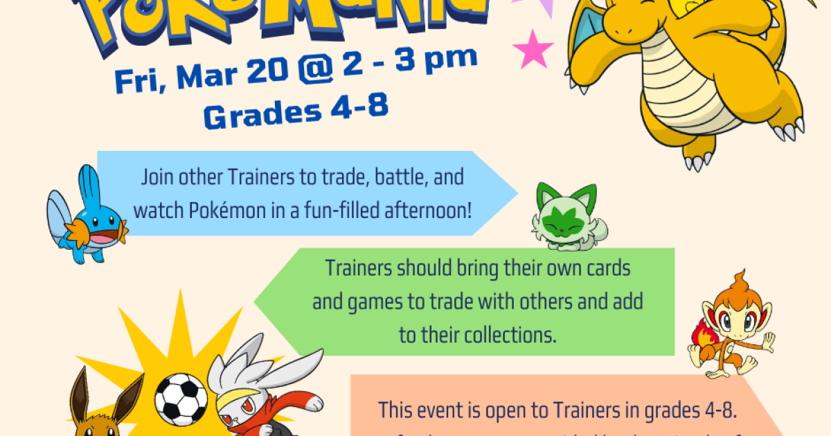 It's PokéMania time! Join other trainers to trade, battle, and watch Pokémon in a fun-filled afternoon! Trainers should bring their own cards and games to trade with others and add to their collections. This program is for youth in grades 4-8.